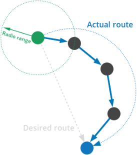 In this case, it is necessary to send the data to another node within the radio range, which then passes it on to another node, and so on until the data reaches the desired destination node.
