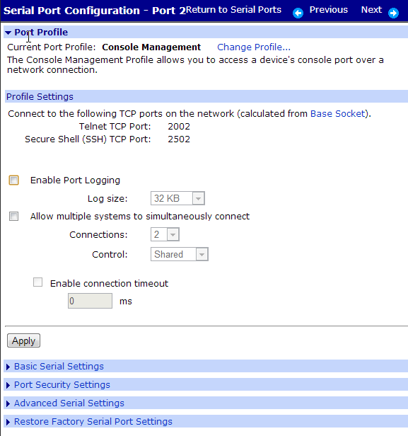Under Console Management you can also enable port sharing. Port sharing allows multiple users to access the port at the same time. If port sharing is disabled, then only one user may access the port at a time. You may change the number of users at any time. If you increase the number of users from 2, the change takes effect immediately. If you decrease the number of users, the change does not take effect until the users log off. For example, if port sharing is available for 9 with 9 users on, then changed to 2, the change will not take effect until at least 2 users log off. If port sharing is enabled for 2 and then disabled, the change will not take effect until everyone is off. The default value when port sharing is disabled is one.