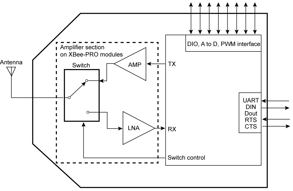 The following diagram shows a simplified view of XBee/XBee-PRO DigiMesh 2.4 hardware.