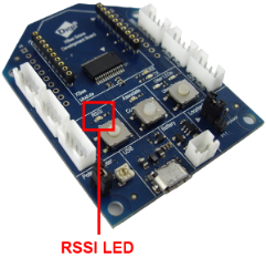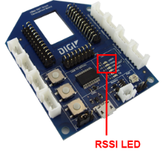 The XBee Grove Development Board includes an LED connected to the XBee module's pin 6. When this pin is configured as the RSSI pin, the LED lights every time the connected XBee module receives data. Its intensity represents the RSSI value of the last-received data: a brighter light means a higher RSSI value and better signal quality.