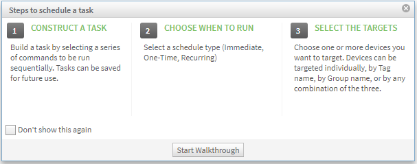 When you click New Schedule in the Schedules screen, the Steps to schedule a task dialog may appear, depending on whether the feature is enabled.