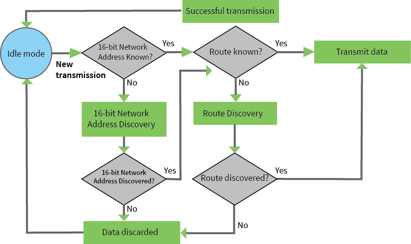 If a 16-bit network address is not provided, a Network Address Discovery takes place. In order for data to be sent, a route discovery takes place for the purpose of establishing a route to the destination node. If a device with a matching network address is not discovered, it discards the packet. The device transmits the data once a route is established. If route discovery fails to establish a route, the device discards the packet. The following diagram shows the Transmit Mode sequence.