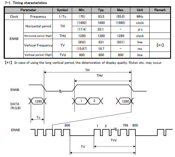 Note The recommended timings from the LCD datasheet often do not work perfectly, as each platform introduces noise and delays that affect the display's signals and timings. You must manually tune the parameters (within the margins in the datasheet) to obtain a good-quality image.