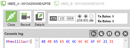 Each character loops back in the XBEE_A console log, which indicates that XBEE_A successfully sent the message to XBEE_B.