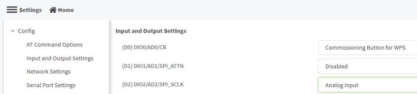 - Select Settings > Config > Input and Output settings and confirm that (D2) DIO2/AD2/SPI_SCLK is set to Analog Input.
