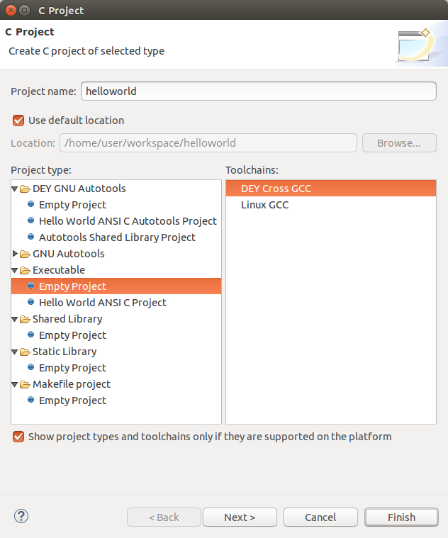 - Select the type of project to create under the C/C++ category. For example, choose C Project.