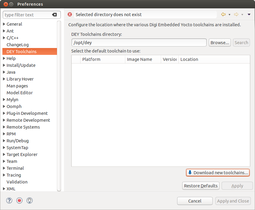 - The installed toolchains table is updated with the new toolchains. Select a new default. See Configure installed DEY toolchains.