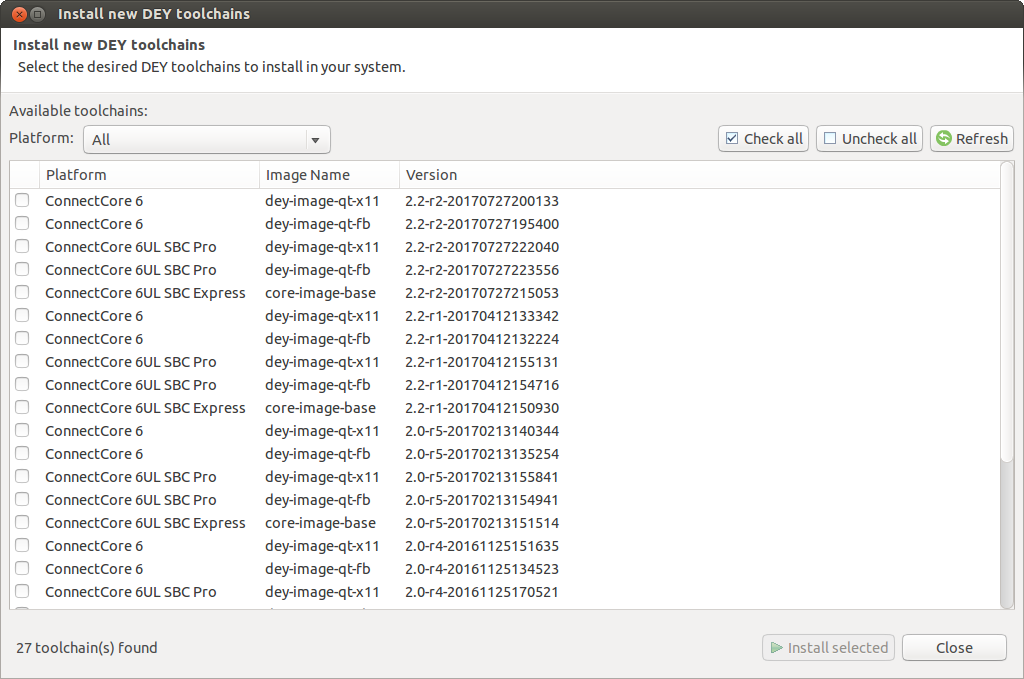 - Click Download new toolchains. The Install new DEY toolchains dialog opens listing all the available toolchains to install: