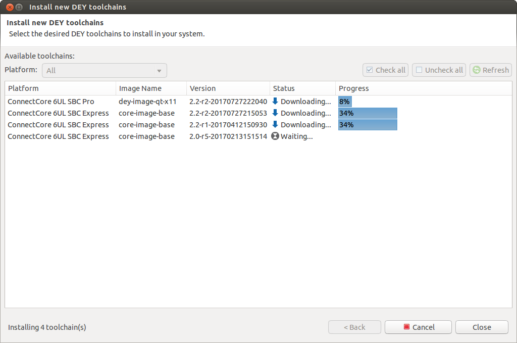 - Once the process finishes, click Back to return to the available toolchains list and continue installing new DEY toolchains, or click Close to close the dialog.