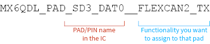 Note You can look closely at the macro to discern how the pin name for the IC is connected to the desired pad functionality. From left to right, the part of the macro after the MX6QDL_PAD_ prefix and up to the double underscore is the PAD/PIN name in the IC. In this example, it is SD3_DAT0. The second part (everything to the right of the double underscore) represents the functionality you would like to assign to that pad.