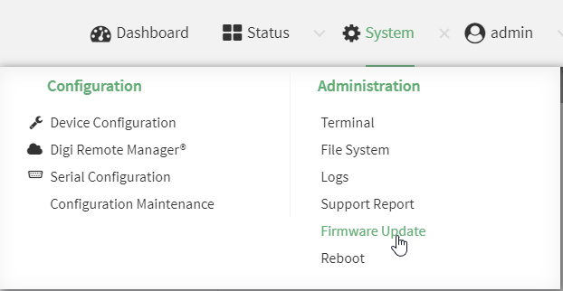 If you have a network of many devices, you can use Digi Remote Manager Profiles to manage firmware updates. Profiles ensure all your devices are running the correct firmware version and that all newly installed devices are updated to that same version. For more information, see the Profiles section of the Digi Remote Manager User Guide.
