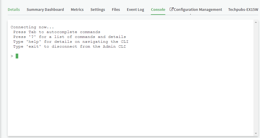 For devices that provide terminal access, Remote Manager allows you to access a device console and execute commands. If you attempt to access a console for a device that is not currently connected to Remote Manager, the message Device Not Connected is displayed.