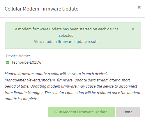 Click View modem firmware update results to open the Data Streams page filtered for this activity.