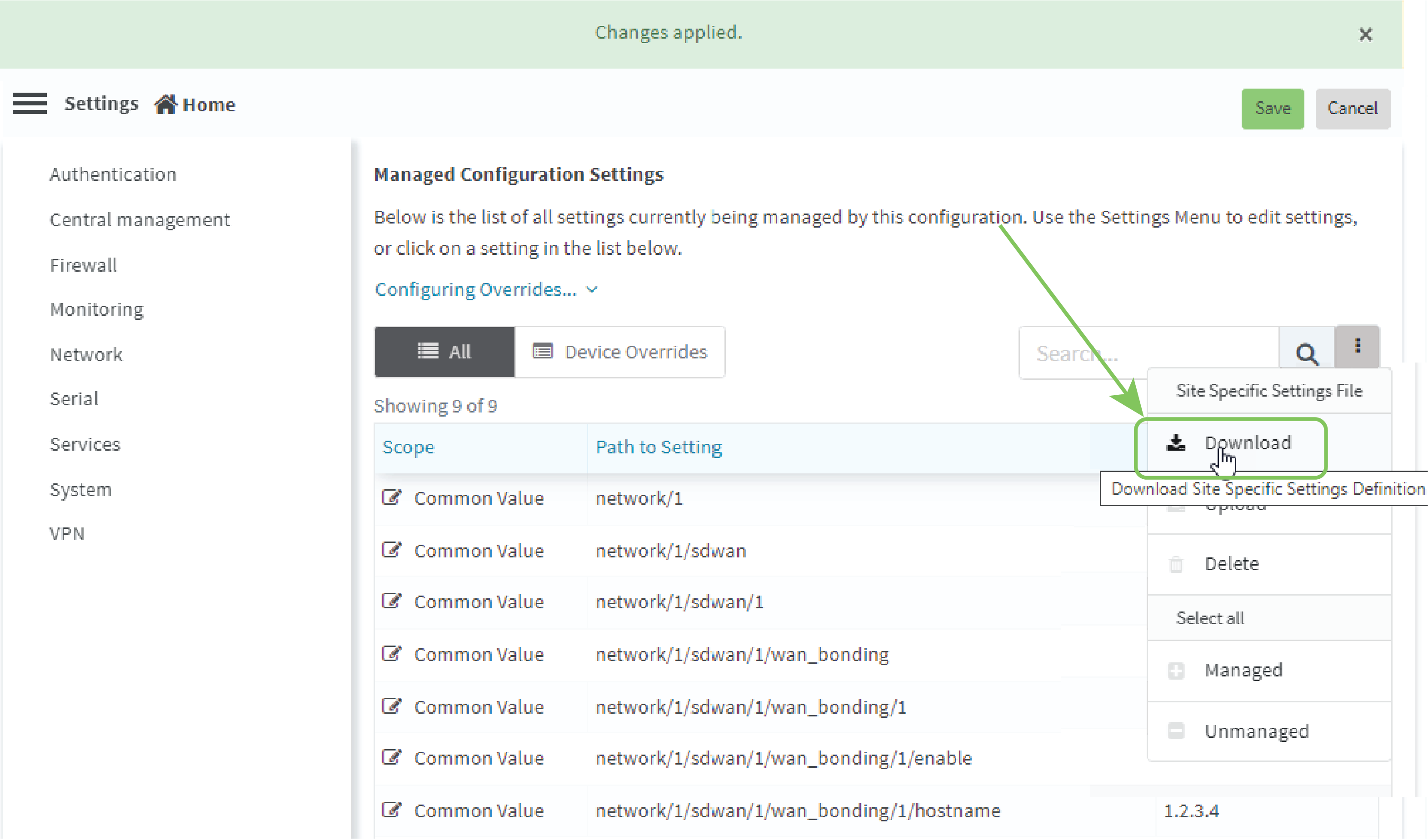 2. Click and select Download to download a CSV file to your local filesystem, which you can use to set site-specific settings.