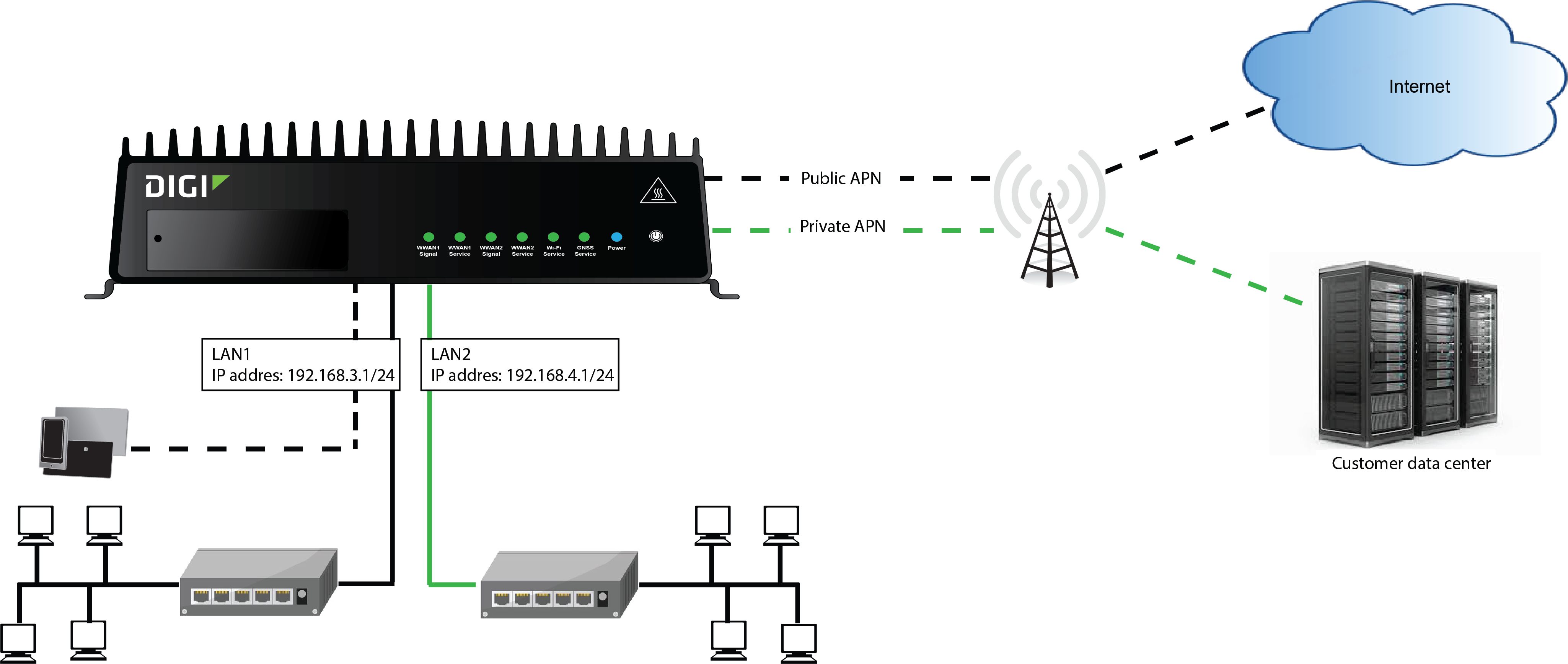 In the following example configuration, all traffic on LAN1 is routed through the public APN to the internet, and all traffic on LAN2 is routed through the private APN to the customer's data center: