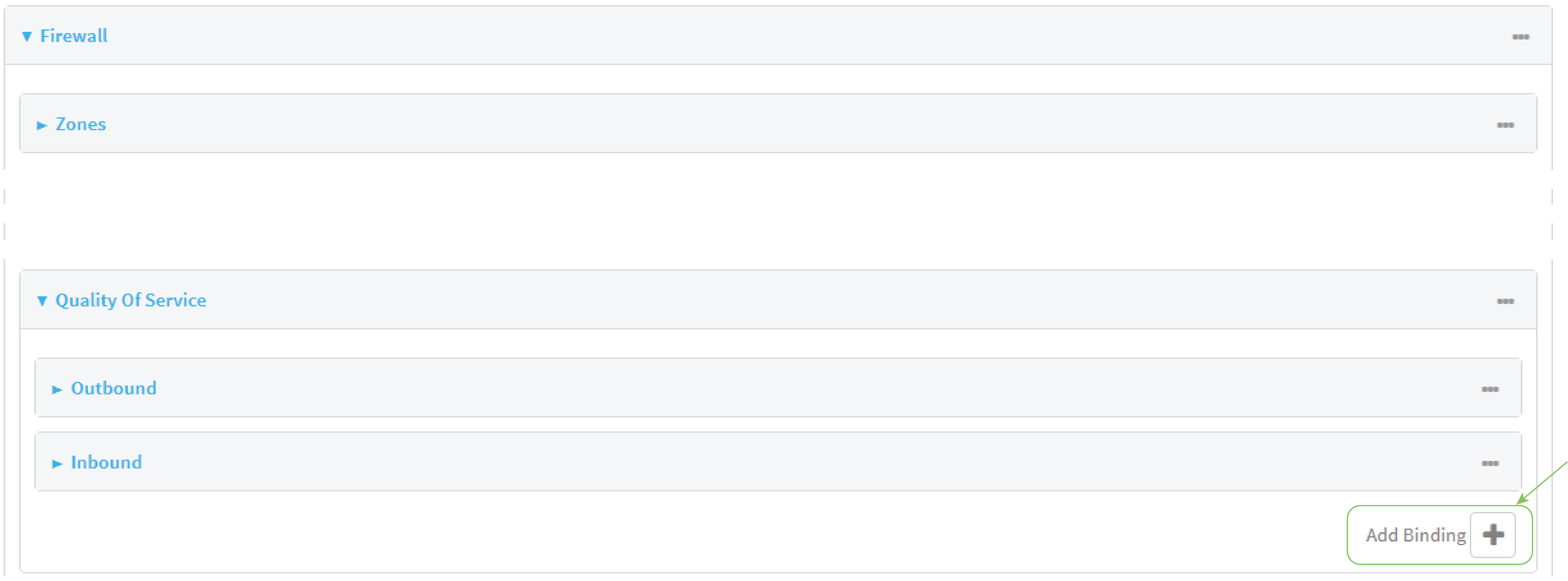 A QoS binding contains the policies and rules that apply to packets exiting the TX64-Rail device on the binding's interface. By default, the TX64-Rail device has two preconfigured QoS bindings, Outbound and Inbound. These bindings are an example configuration designed for a typical VoIP site: