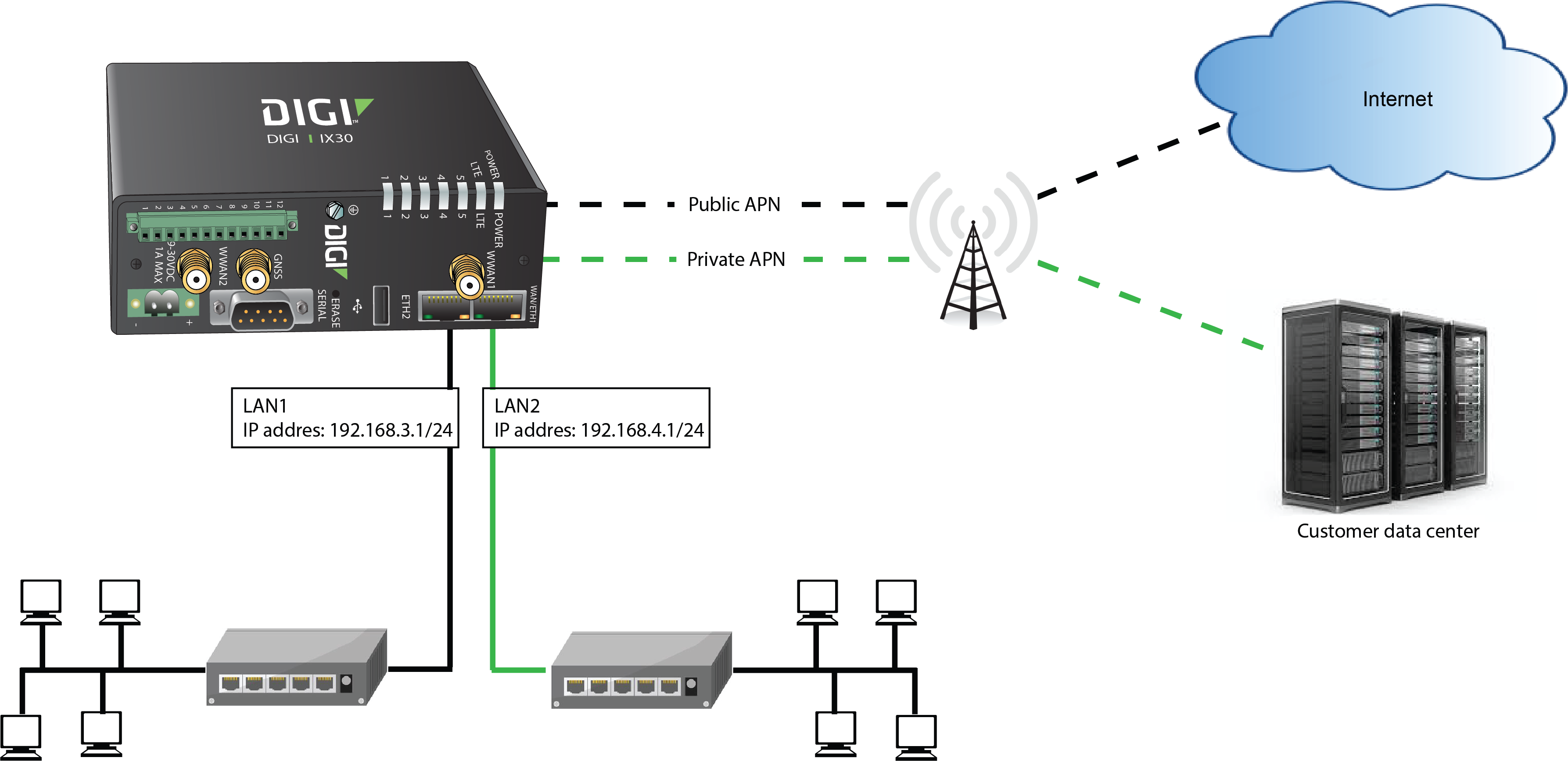 In the following example configuration, all traffic on LAN1 is routed through the public APN to the internet, and all traffic on LAN2 is routed through the private APN to the customer's data center: