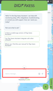 Click the icon to display the Digi Axess Assistant question page. Type your question into the field provided and the answer displays in the same window.