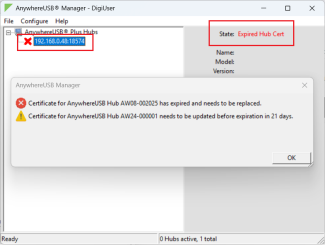 Once a Hub has a new certificate and is online, none of the AnywhereUSB Managers that try to connect to it will succeed. In the Manager, the Expired Hub Cert state displays when you click on the Hub, and an informational dialog displays. You can click OK to close the informational dialog.