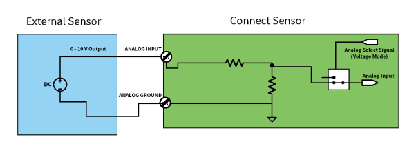 The Connect Sensor+ can monitor a voltage input from 0 V to 10 V. The following schematics show wiring options for 0-10 V input.