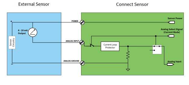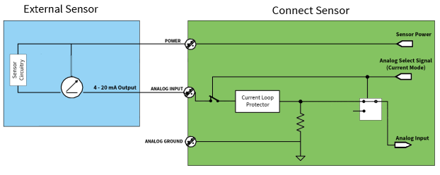 You can connect the Connect Sensor+ to a 4/20 mA 2-wire sensor, which is also known as a loop-powered sensor.
