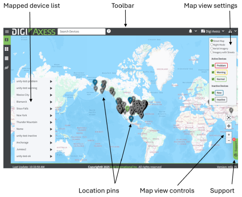 Devices that have latitude and longitude coordinates assigned are noted with a location pin on the Digi Axess map. |