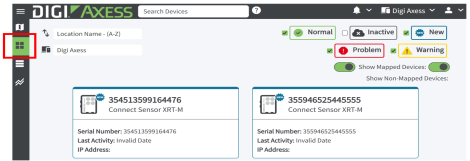 A set of Digi Axess location status filters displays at the top of the grid. You can use these to specify which types of devices should be displayed. The location status and color is determined by the Location Status items, which are a set of metrics tracked by the firmware.