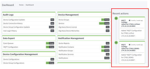 The Recent Actions section on the right side of the page shows a time line list of the changes the user that is logged in has made. You can also review the history for device groups, devices, notification contacts, and notification groups in the associated page. See Review the update history.