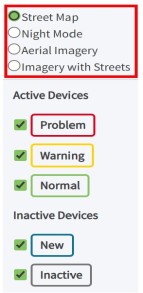 A set of Digi Axess map imagery options displays on the map page in the upper right corner by default. You can choose the imagery option that provides the level of detail you need.