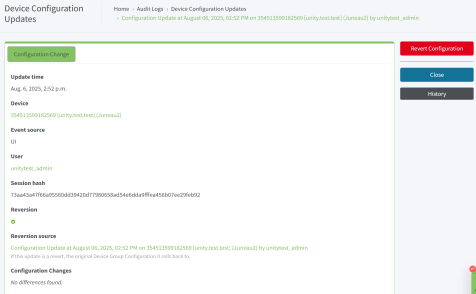 The source of the reversion is listed. Click the link to display the changes in the Configuration Changes field. If this update is a reversion to a previous configuration version, the reversion source is the device configuration it rolls back to. Note This field has an entry only if the reversion icon is a green circle. |