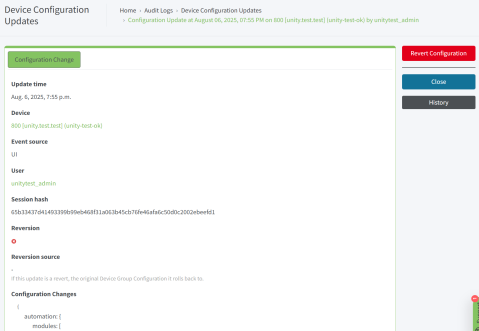 Revert Configuration button: Click Revert Configuration to revert the configuration for the specified device back to configuration that was installed before the previous update.
