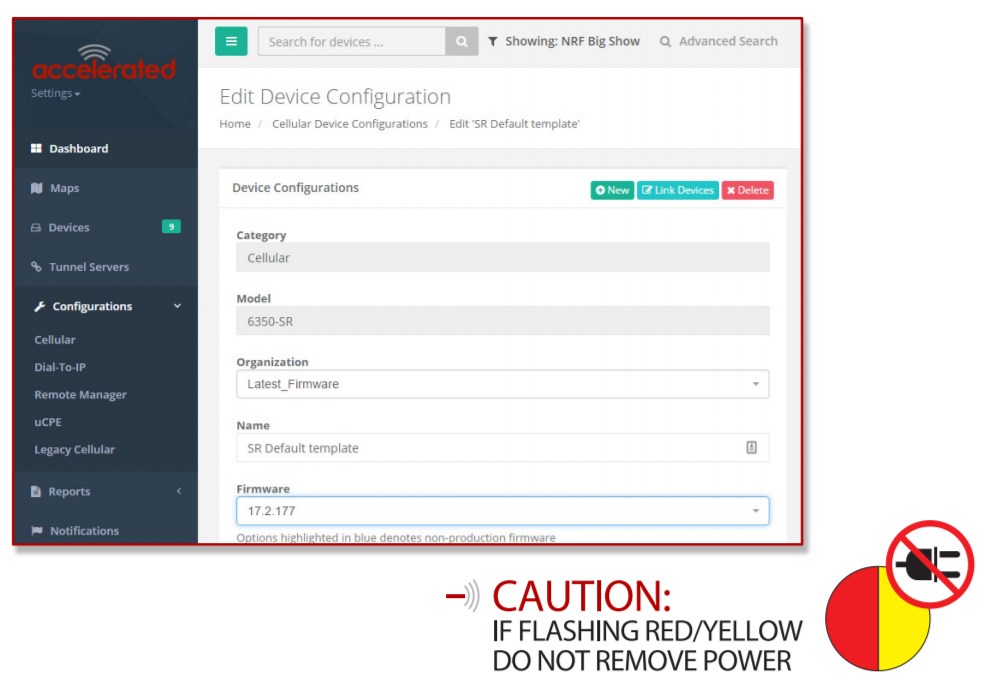 WARNING! When the Digi 6350-SR/6355-SR is updating firmware, its LEDs will flash red and yellow. Do NOT remove power from the device during this process.