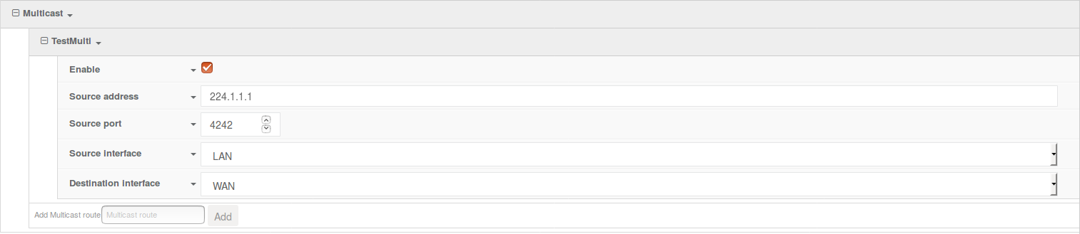 In Services > Multicast, insert a new name for the multicast route (for example, TestMulti) and press Add.