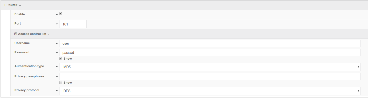 $ snmpget -l authPriv -u user -A passwd -X passwd -x DES -a MD5 192.168.2.1 1.3.6.1.4.1.40083.1.1.14.0