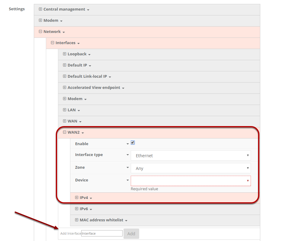 - In the Network -> Interfaces section, specify a name for the new interface and click Add.