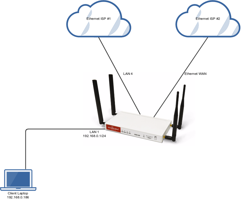 The sample configuration below shows a Digi 6350-SR/6355-SR with two Internet connections established via Ethernet cables. Ethernet ISP #1 is connected to the reconfigured LAN (port 4) interface, and Ethernet ISP #2 is connected to the WAN Ethernet port.