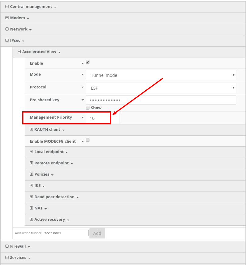 Open the configuration profile for the router. Under IPSec -> aView, set the Management priority to 10. This will tell the router to treat the aView IPSec tunnel as the highest priority management interface, which it then reports to aView as the IP that can be used to access its console.
