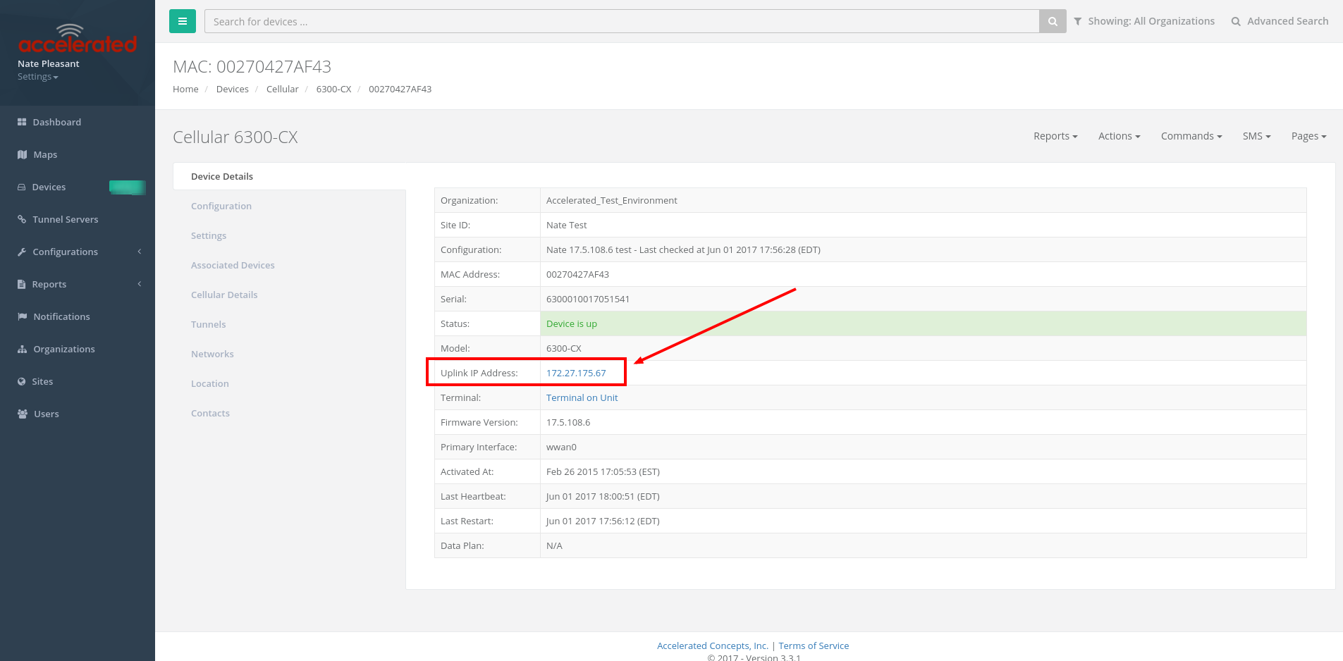 Once you apply the new configuration to the router, reboot the device so it rebuilds the IPSec tunnel and reports the new IPSec local IP address to aView. You can verify that aView is using the IPSec local IP as the management IP by looking at the Uplink IP address on the Device Details tab. This value should be set to a 172.x.x.x IP address.